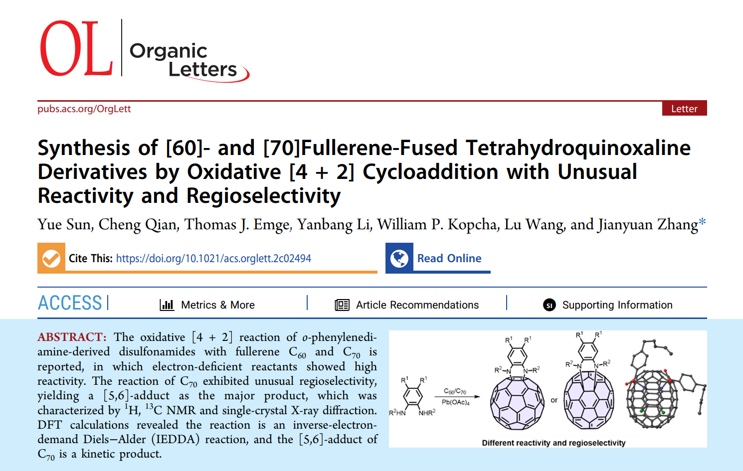 Yue’s work entitled “Synthesis of [60]- and [70]Fullerene-Fused Tetrahydroquinoxaline Derivatives by Oxidative [4 + 2] Cycloaddition with Unusual Reactivity and Regioselectivity” has been accepted by Organic Letters and is available online at https://pubs.acs.org/doi/10.1021/acs.orglett.2c02494